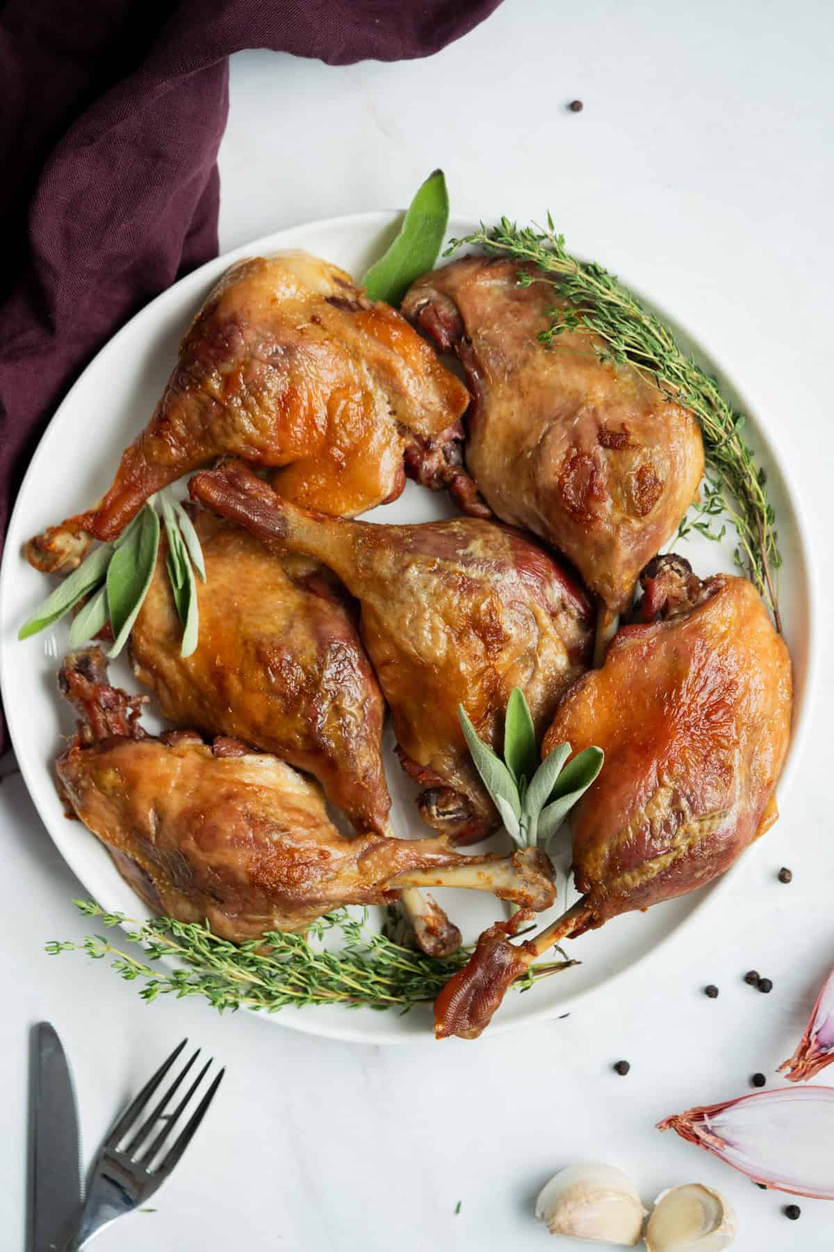 - Dry Brine the Duck Legs:Rub the duck legs with 6 teaspoon of salt, then tuck in the herbs, garlic cloves, juniper berries, and halved shallots. Cover and refrigerate for 24-48 hours.